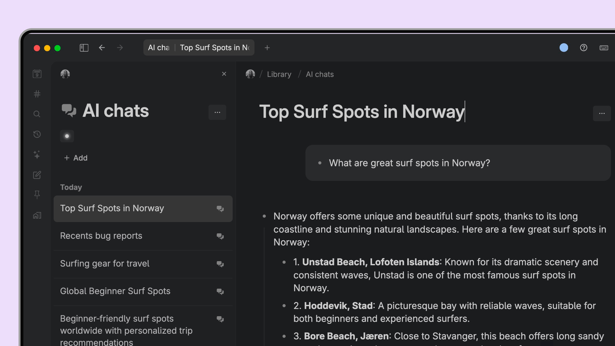 AI chats created from the sidebar view now live under a single node in your Library called AI chats. This replaces the old behavior where chats appeared on Today, which made it harder to manage or exclude them from searches.