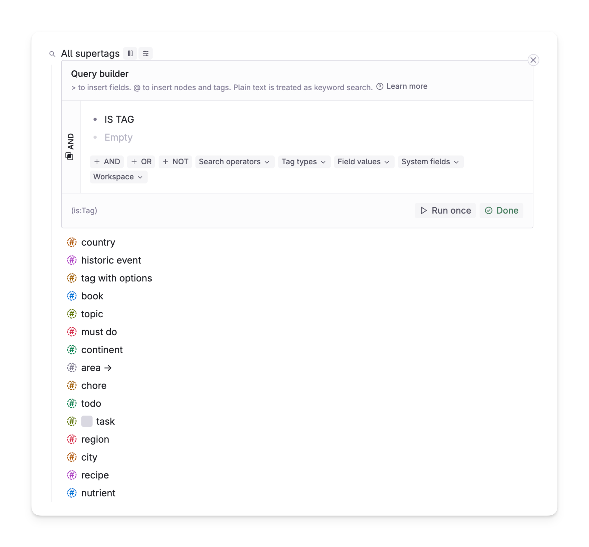 Before diving into cleanup, take time to understand your current state. Create a place where you list out all your supertags, fields, and how they're currently being used. Don't worry about organizing them yet β this is just an inventory.