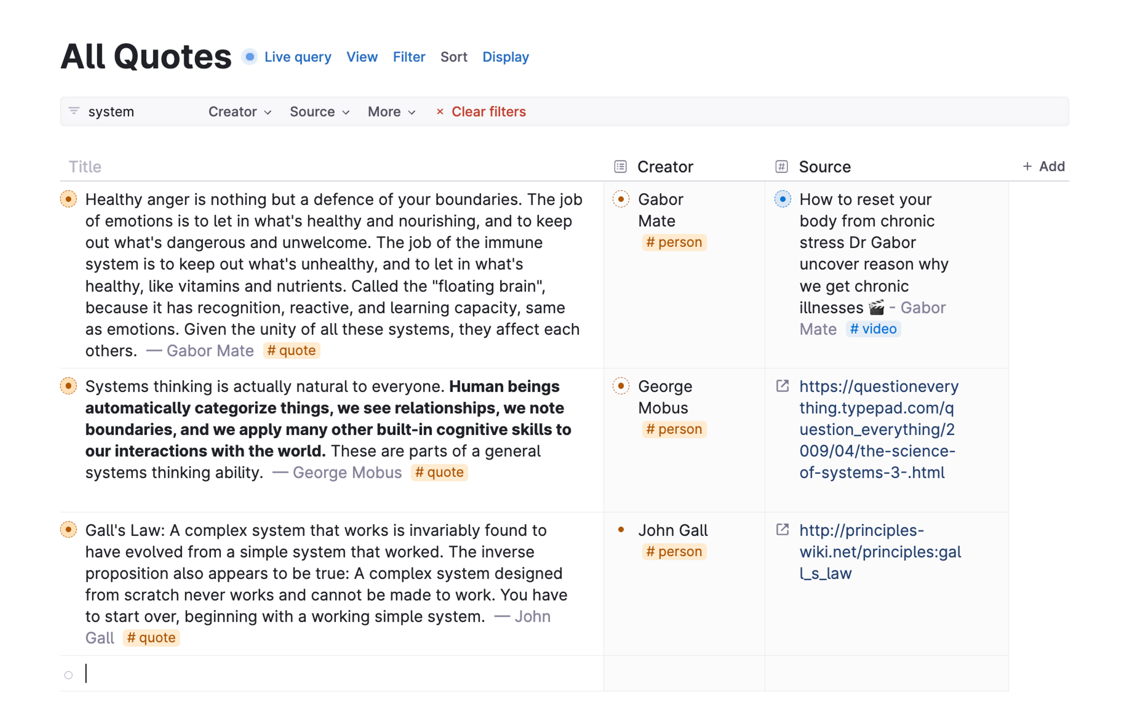 Supertags give you superpowers when it comes to systematizing structure. In the section above, we explored how certain objects have enduring qualities and attributes. This leads us to wanting all our #books to have the same fields, but different from our #projects, and different from #people etc. All nodes with a certain supertag will inherit the fields and content defined in the supertag configuration, making it very easy to keep a structure consistent everywhere.