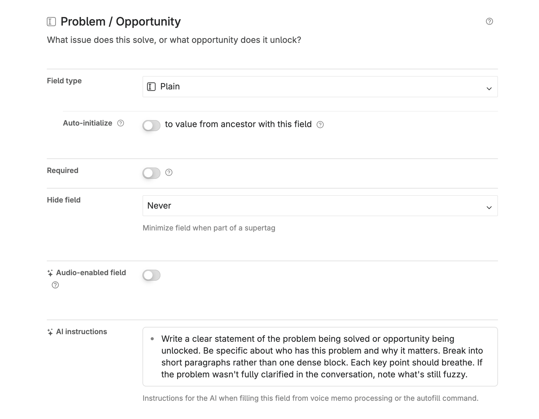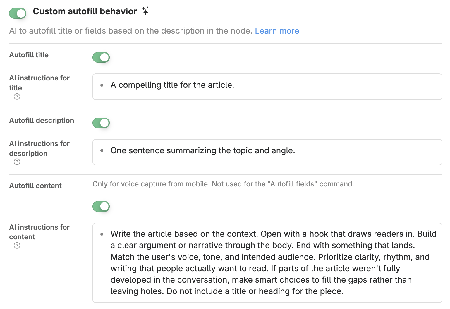 - Autofill content instructions – how to summarize the conversation into the node's content. Consider the supertag's purpose and what output would be most useful.