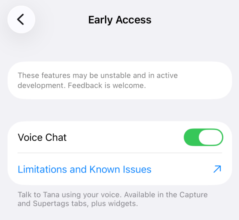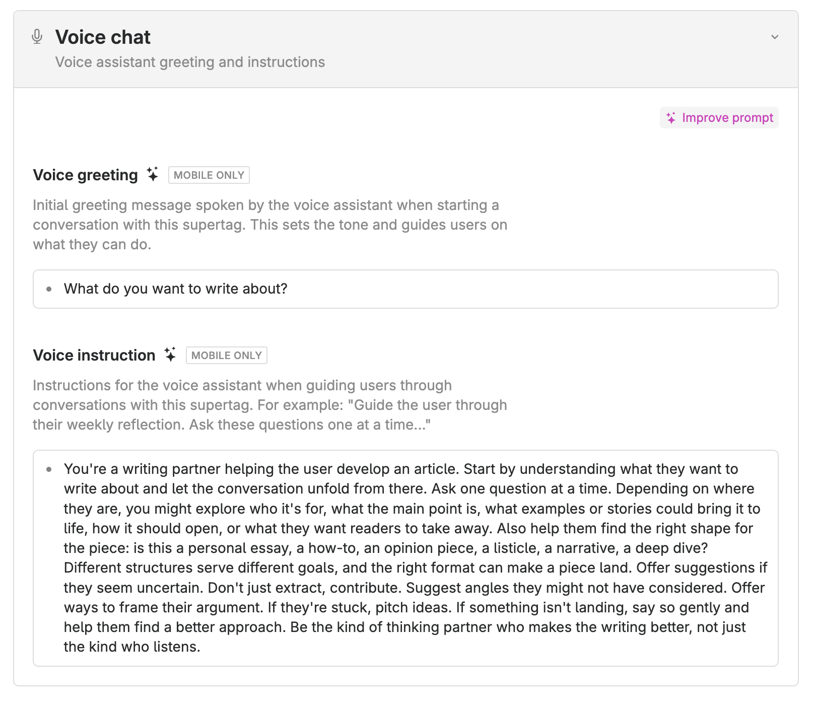 Voice chat works without any configuration, but you can customize how the AI behaves for specific supertags. Configuration is done on desktop, then syncs to mobile.