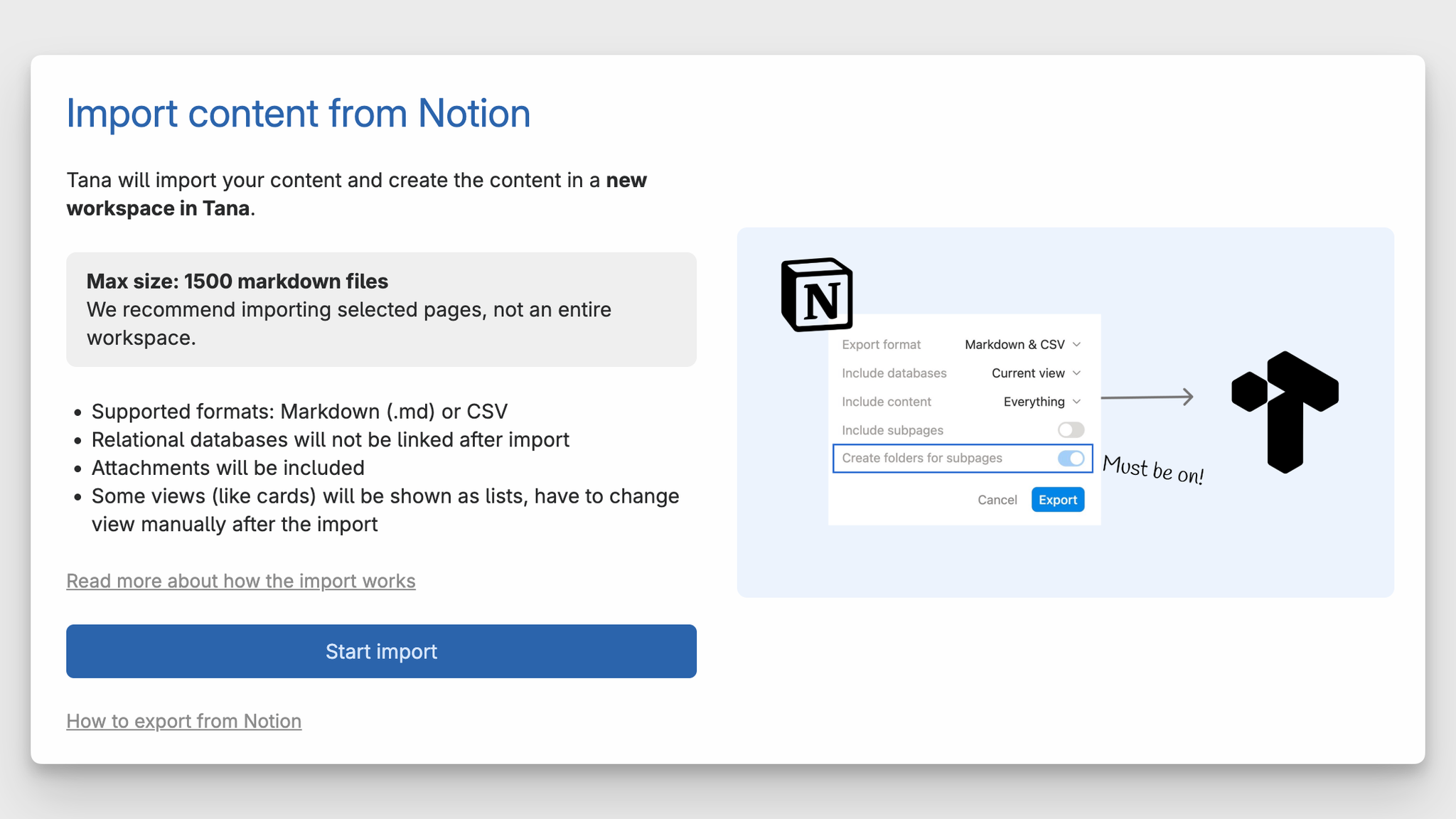Tana supports Notion exports in Markdown (.md) or CSV, up to 1500 Markdown files in one import. This gives you room to bring over substantial project documentation, research pages or operational material.