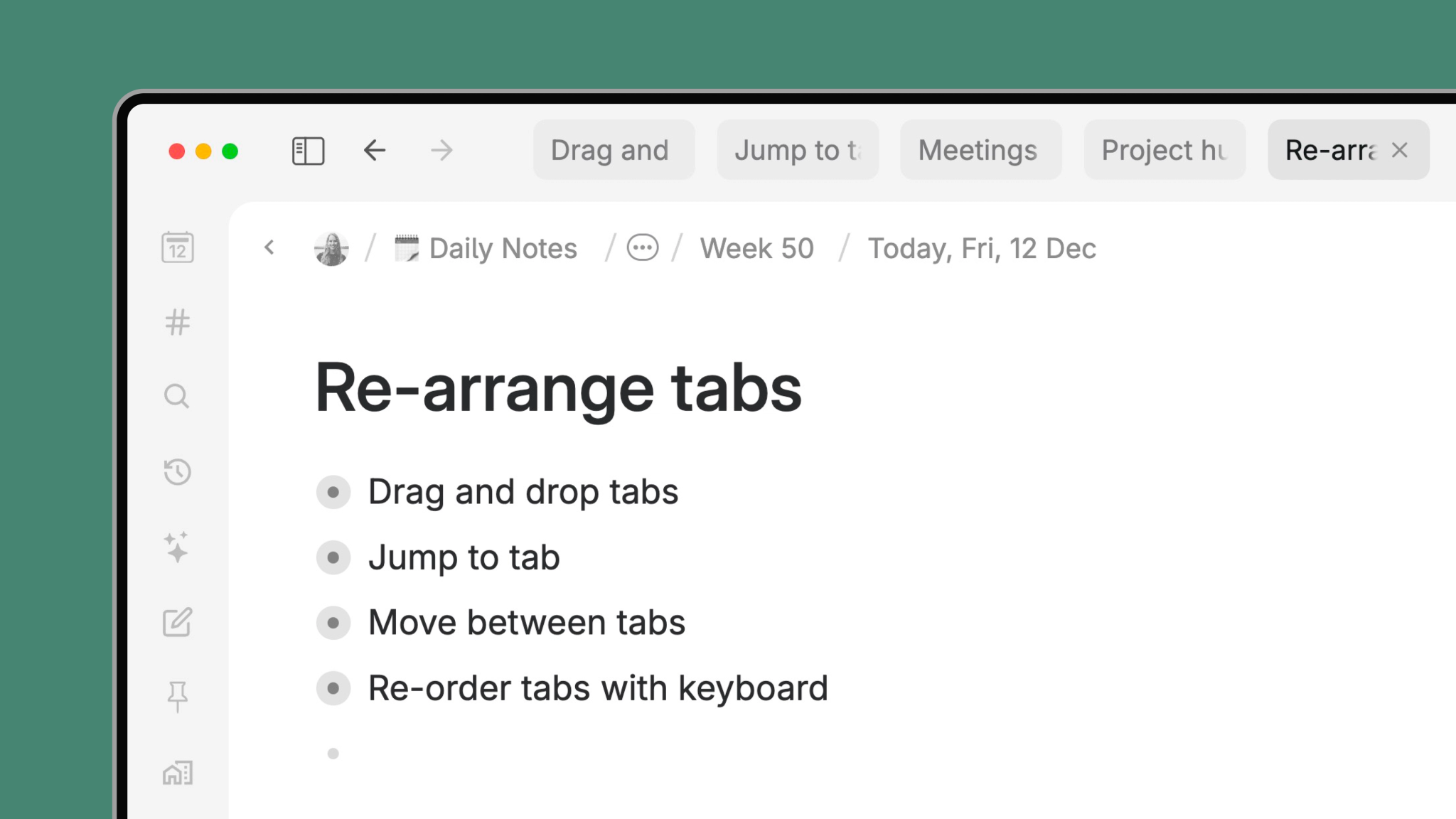 ArticleReorder tabs in Tana desktop for faster focusReorder tabs in Tana desktop using drag and drop or keyboard shortcuts to shape your workspace and move faster without losing focus.
