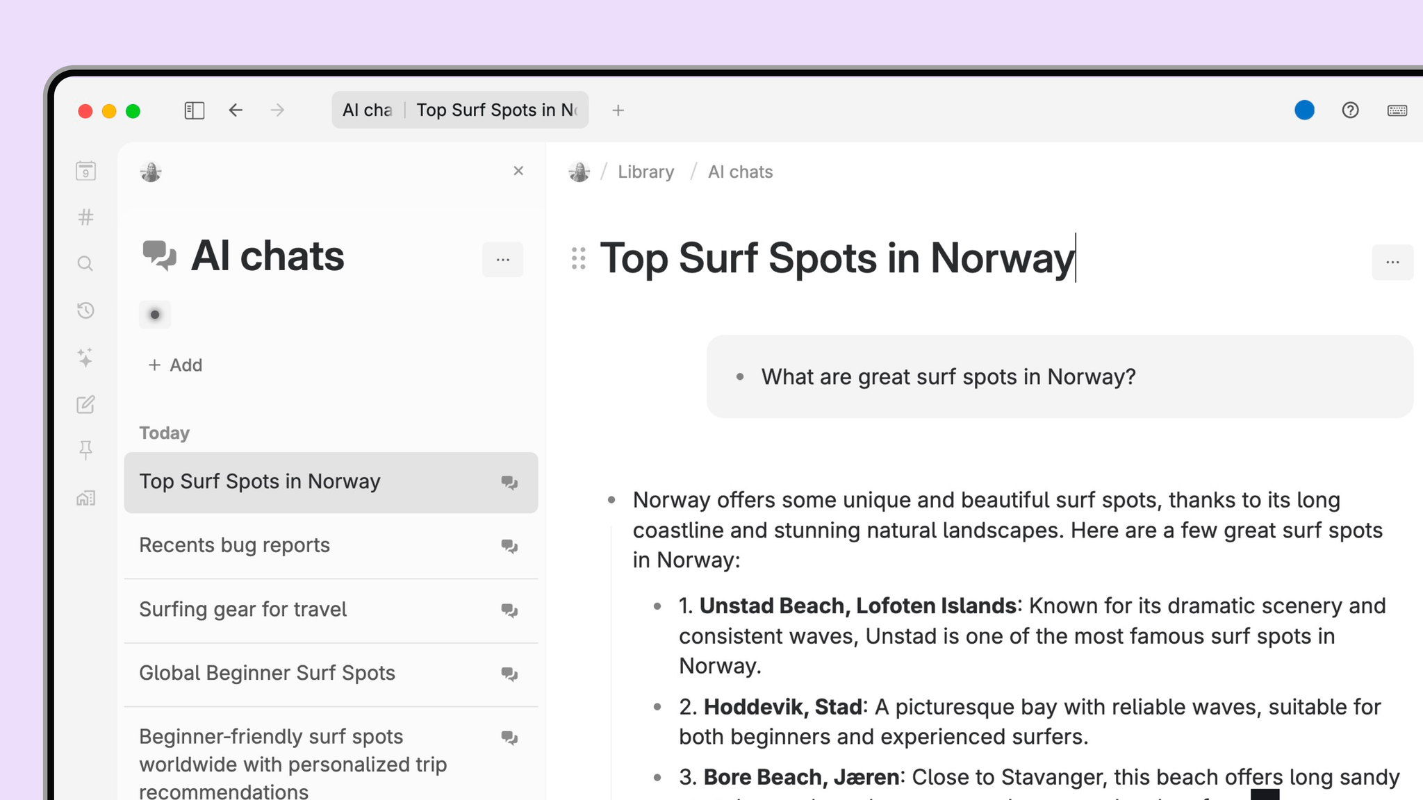 ArticleA better AI chat experience in Tana: new design, full chat history, and smarter storageTana’s AI chat is now faster to use, easier to navigate, and more powerful for long-running work. With a redesigned chat interface, show chat history in the sidebar, and improved storage that keeps your graph clean, this update makes AI a more reliable partner in your daily workflow.