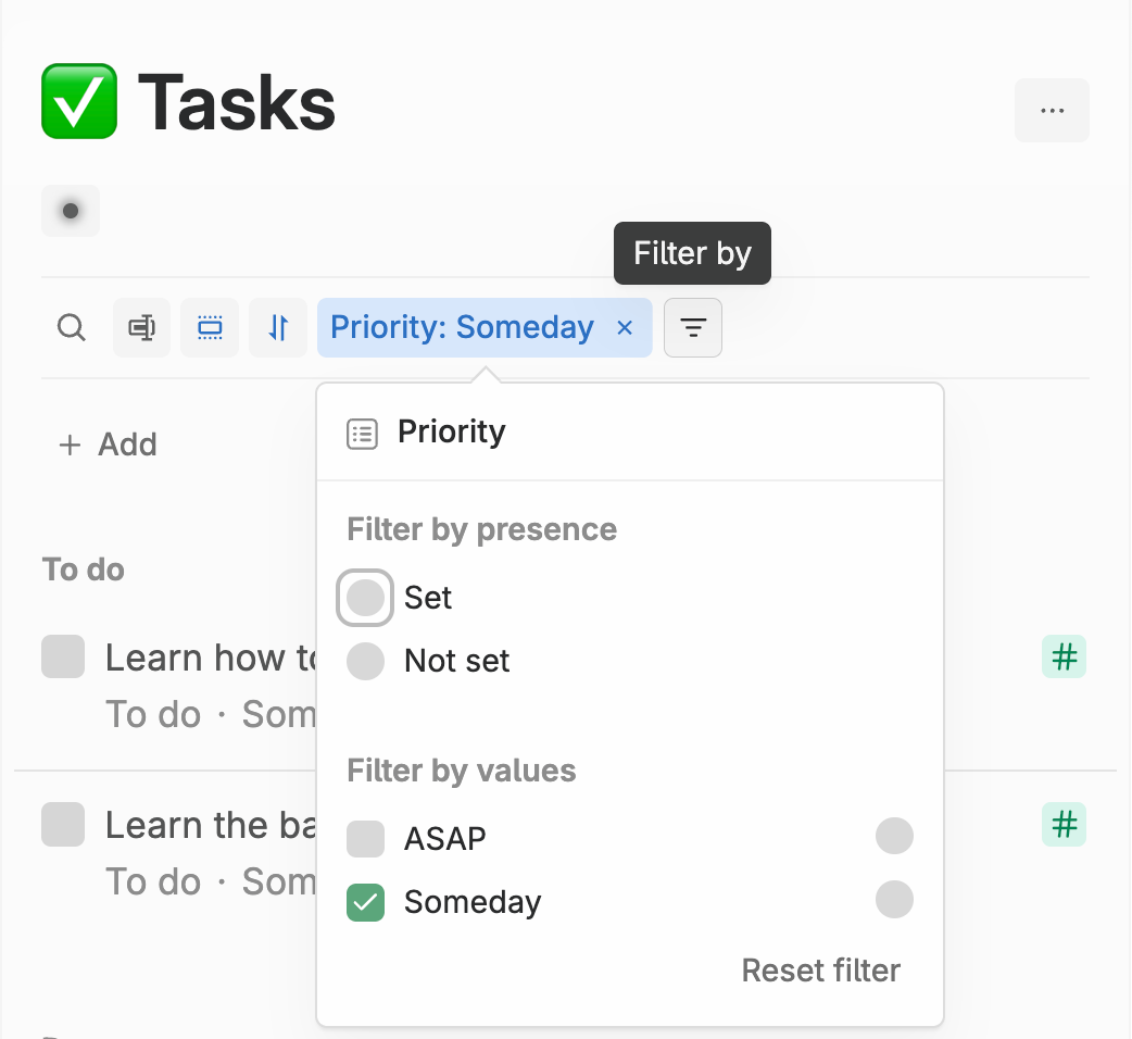Granular control of what you see: Customize your views through view options like Filter, Sort, Group and Display. These options give you a lot of control over what you see, and how you see it. Bonus: for long lists, use pagination (see Page size) to limit how many results you see at the time.