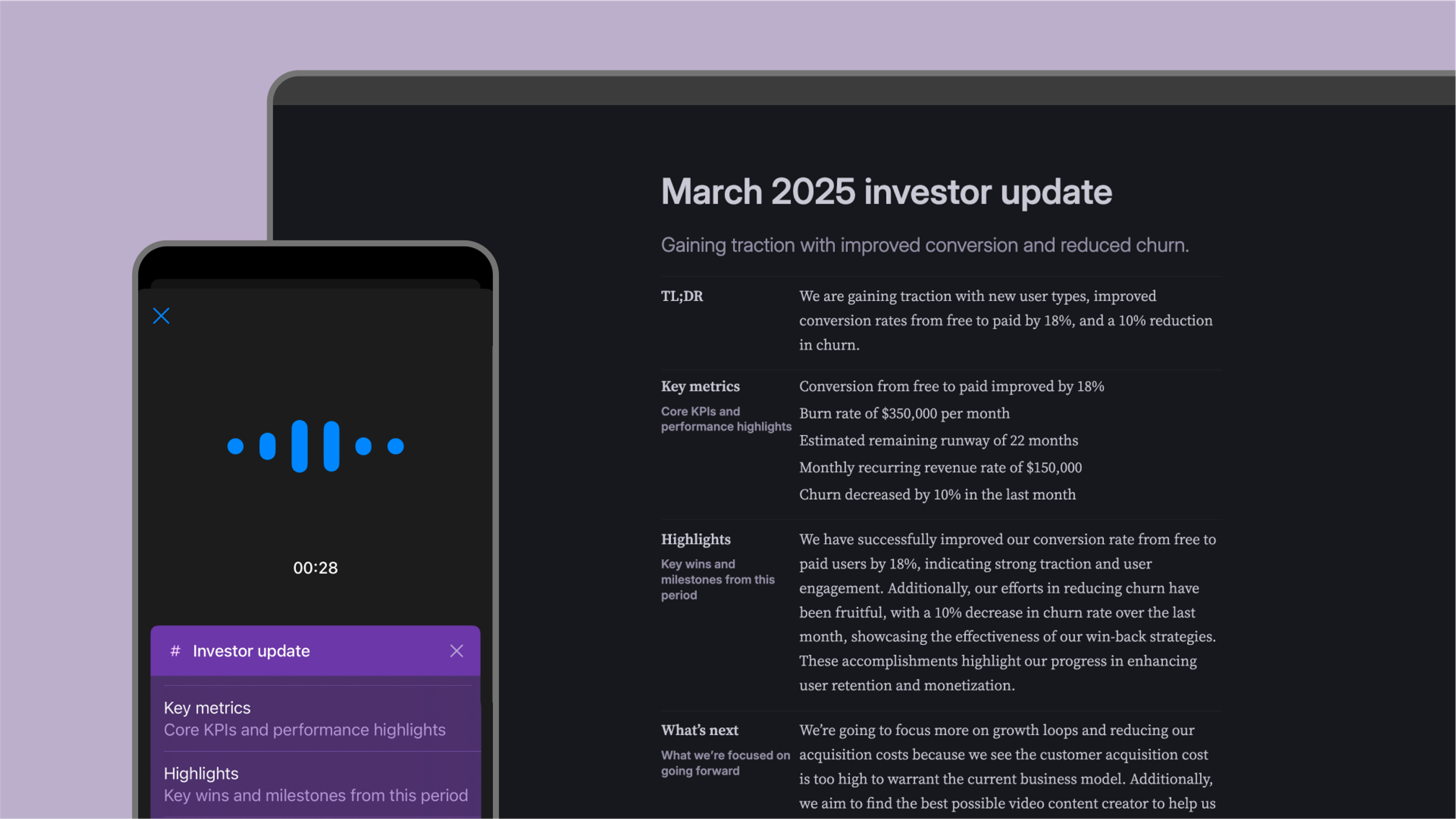 AIBy TanaStress-free Investor UpdatesLevel up your investor communications with Tana's investor update template. Designed for founders who know consistent, high-quality updates are the backbone of investor relations. Our template takes the headache out of the entire process, helping you consistently deliver professional updates that showcase your progress and keep investors excited about your journey.
