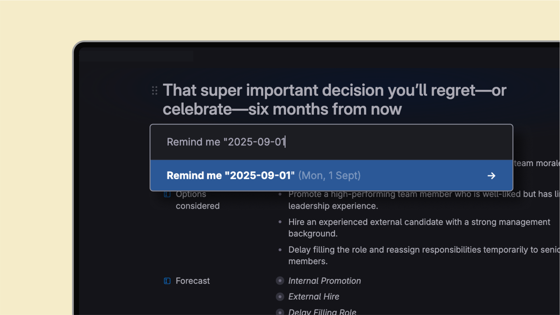 With Tana Remind Me you can schedule a decision review—so you remember to check in on that super important decision you made 6 months ago. Choose when you want to conduct the interview and a link to the decision will appear on your daily notes page on that date.