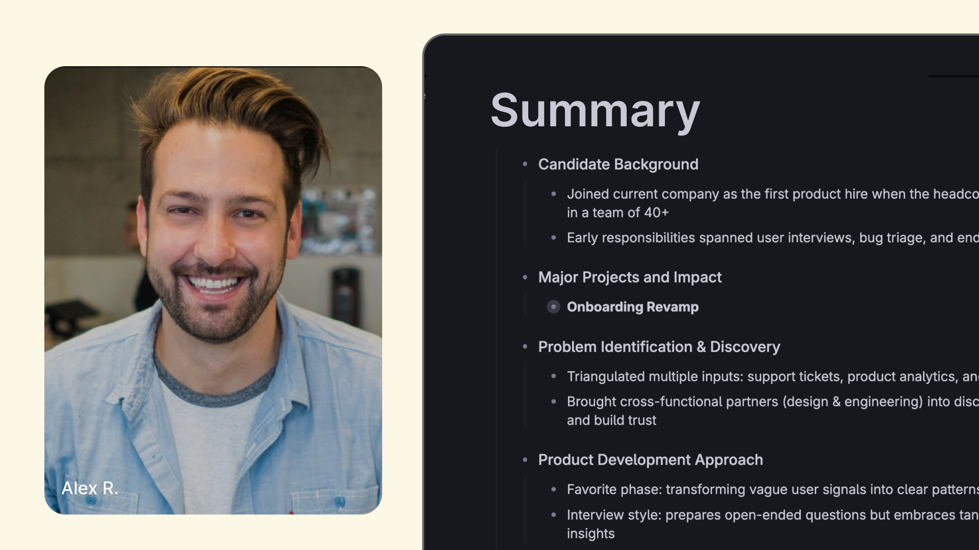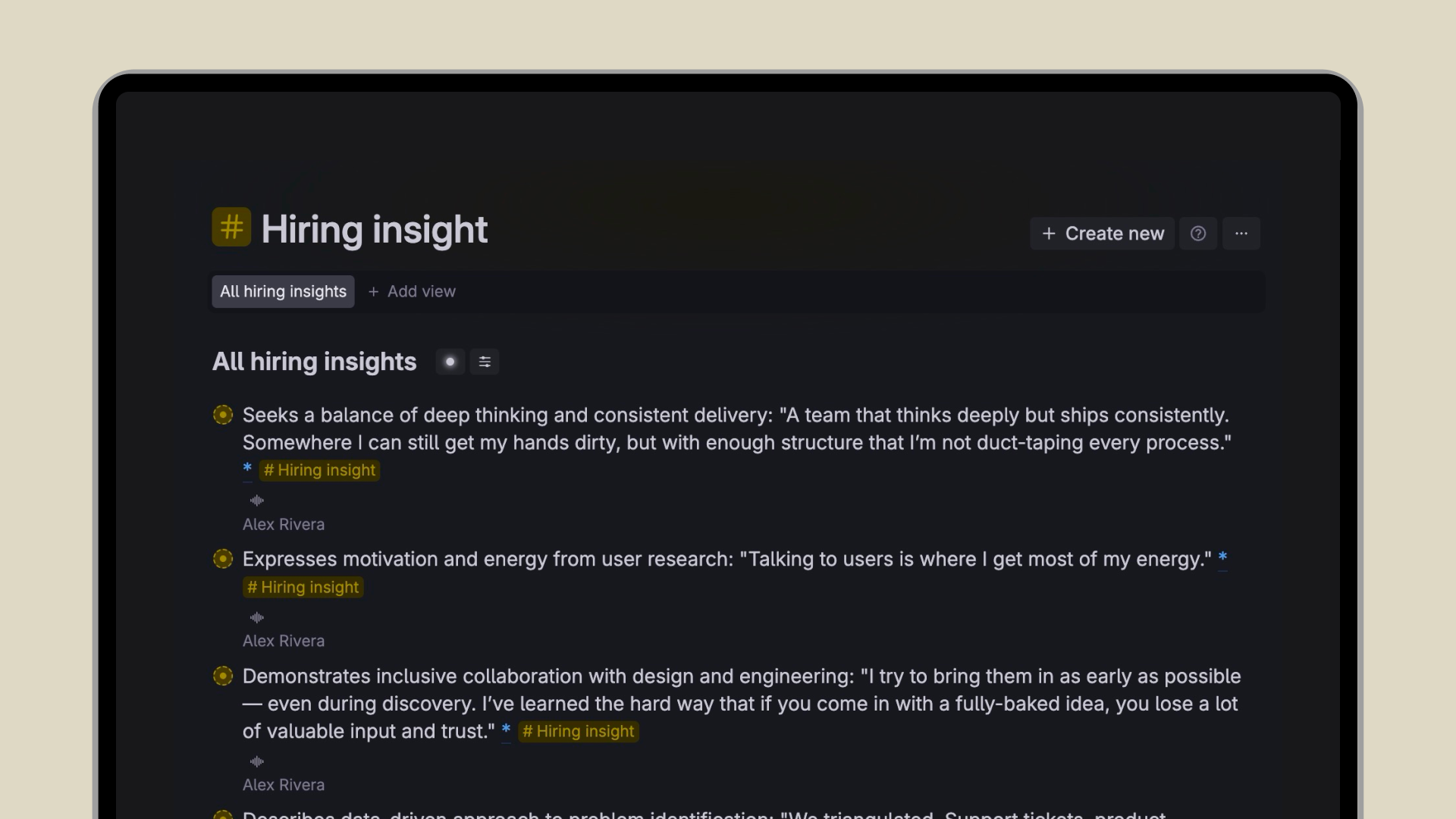 Compare notes (and candidates) with neatly tagged insights from each interview. Filter, sort, view as a table and build a dashboard for your assessment criteria.