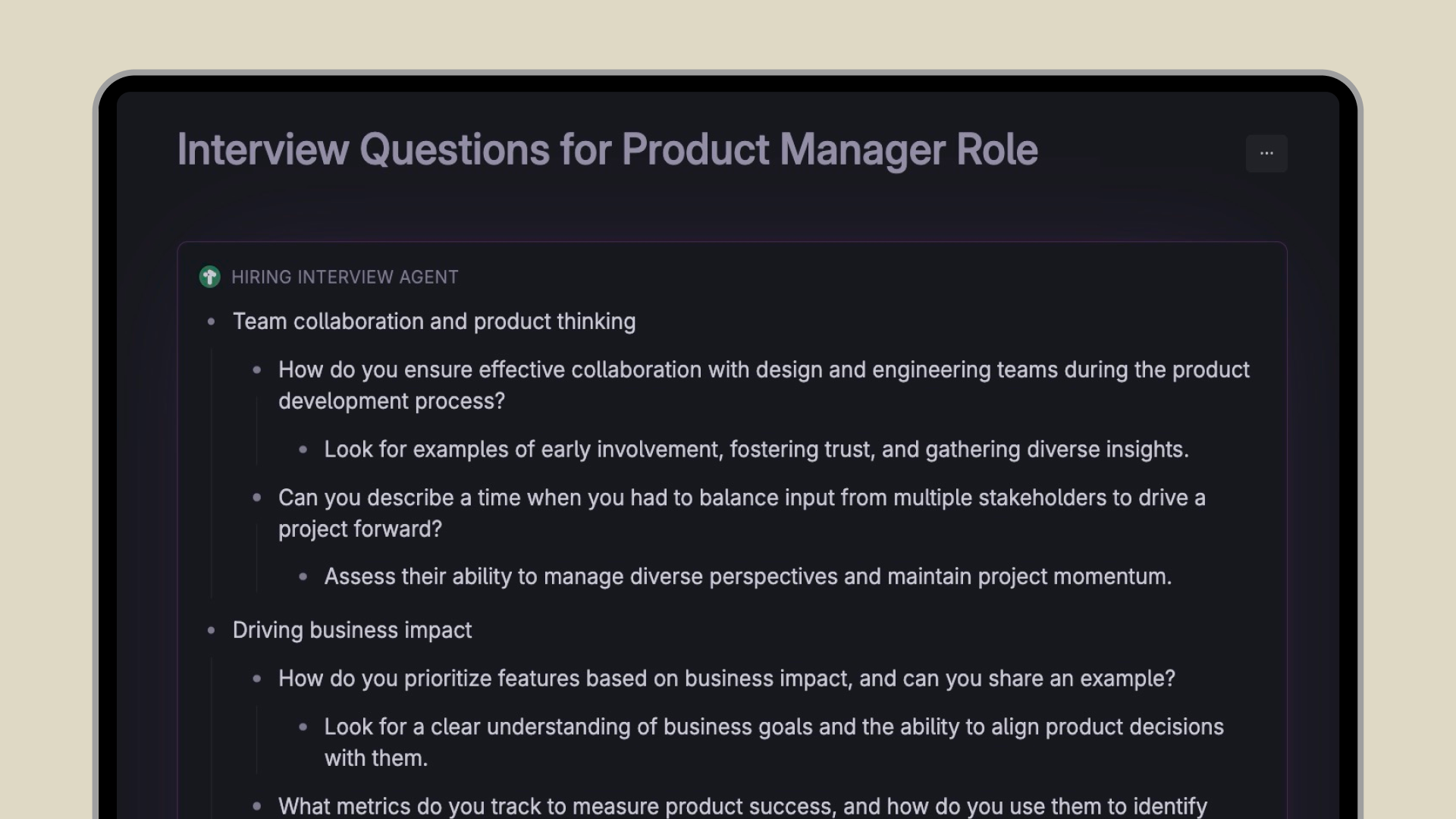 The Hiring interview agent can help you prepare questions tailored to the role, based on the description of the role and the interview focus field. Work with the agent in chat and make your own edits to develop an interview guide that covers what you need.