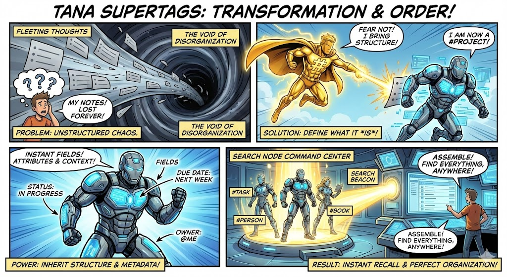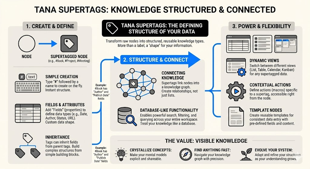 Your notes, fields, supertags, and nested information automatically inform the infographic generation. Tana's structured context becomes the input. No manual data entry or design work.