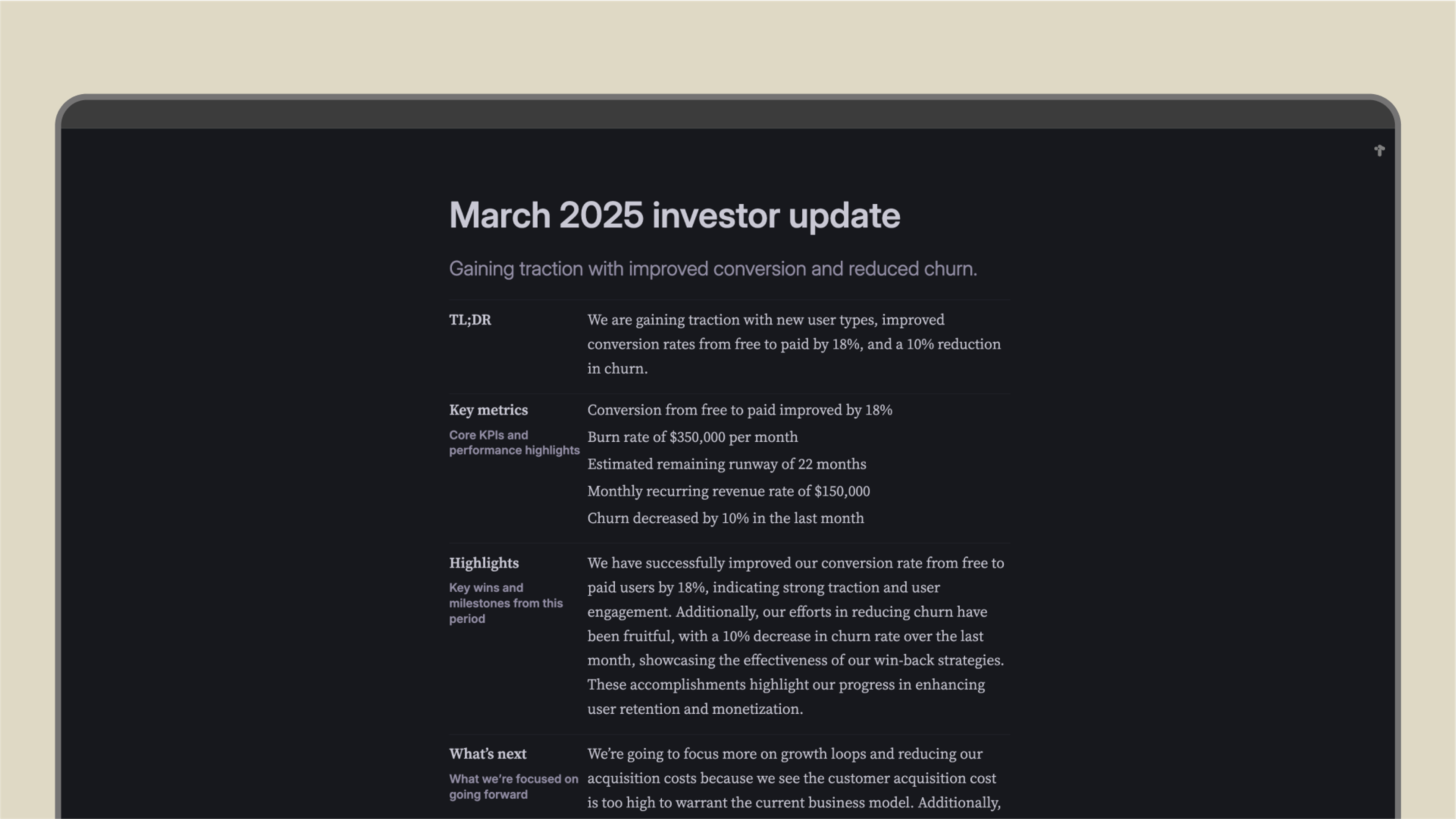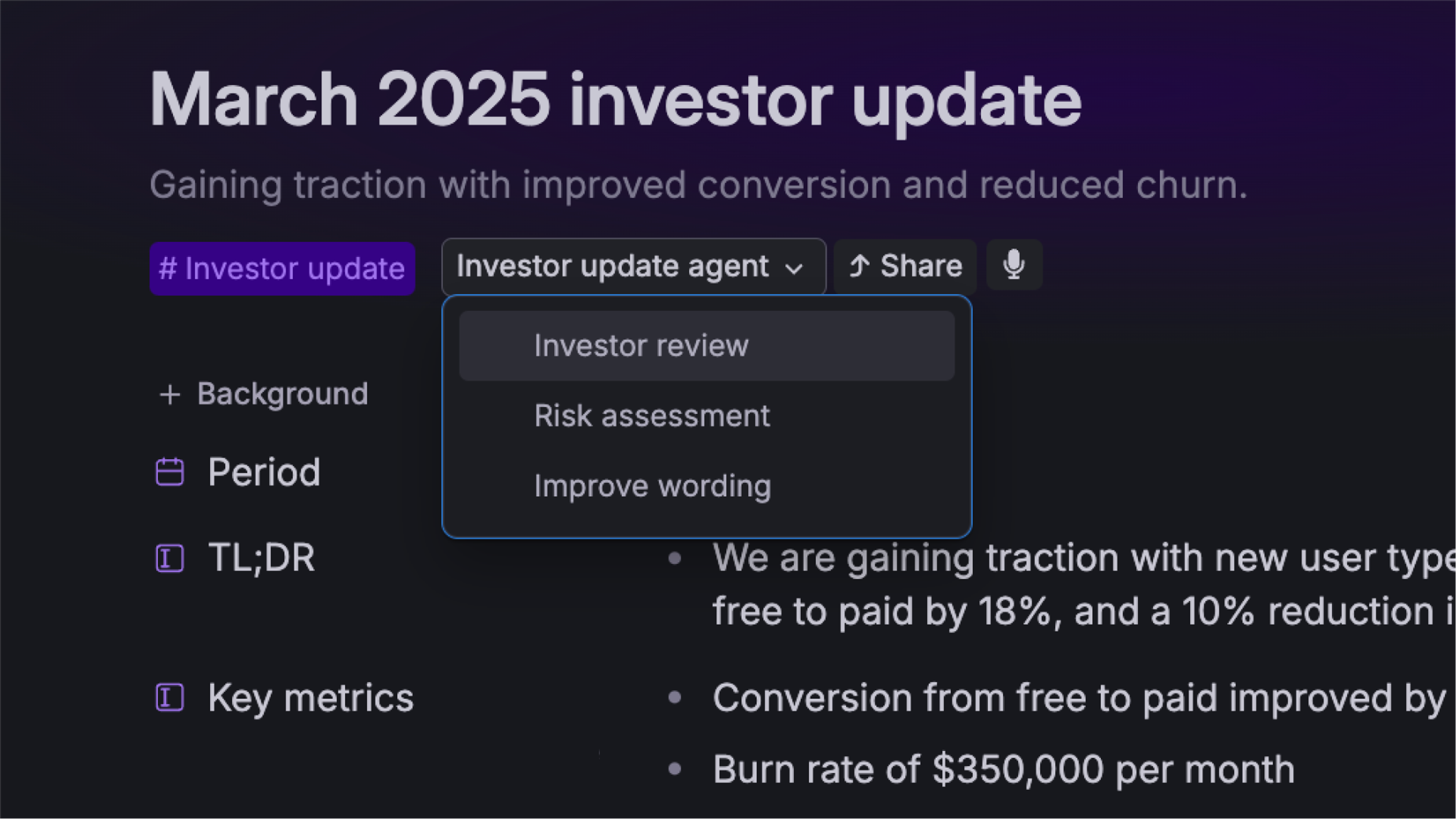 With the Investor Update Agent you can quickly get an investor's point of view on your update—improving clarity and ensuring you're answering the right questions, the right way.