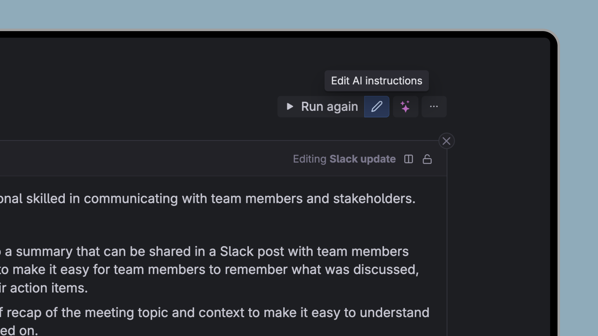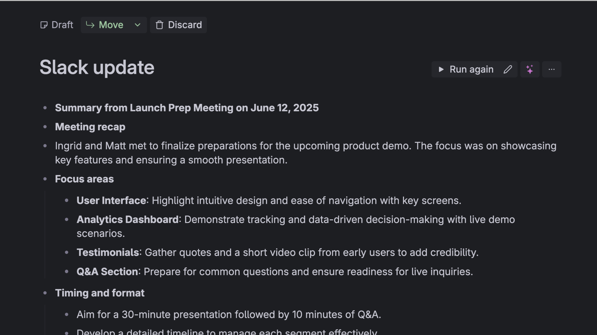 The Meeting rewrites template helps you turn meeting notes into tailored updates for different audiences, making it easy to communicate the right details to the right people – whether they need a quick Slack summary or a detailed executive brief.