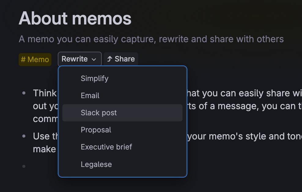 Rewrite with purpose. Easily transform your memo into different formats like emails, Slack posts, or proposals with one click. Choose from built-in rewrite options or create your own.