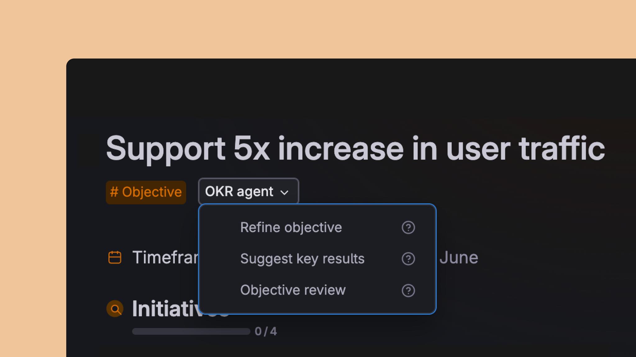 The Tana OKR agent can help refine your objectives and key results, so your OKRs become more effective and actionable. Click on the OKR agent and select what type of input you want.