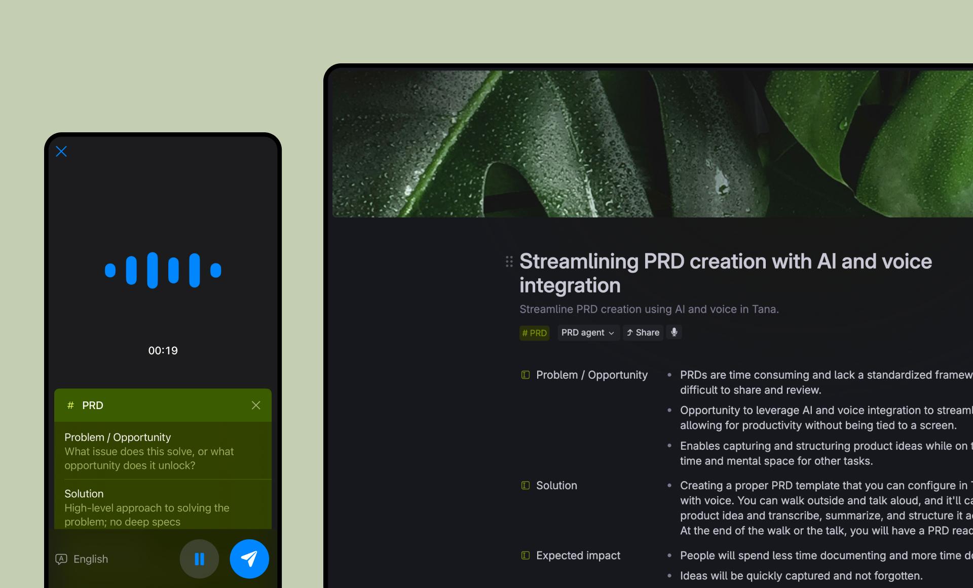 3. Once done the voice memo will get the necessary fields and structure of a PRD, and be ready to share with the Tana Publish feature.