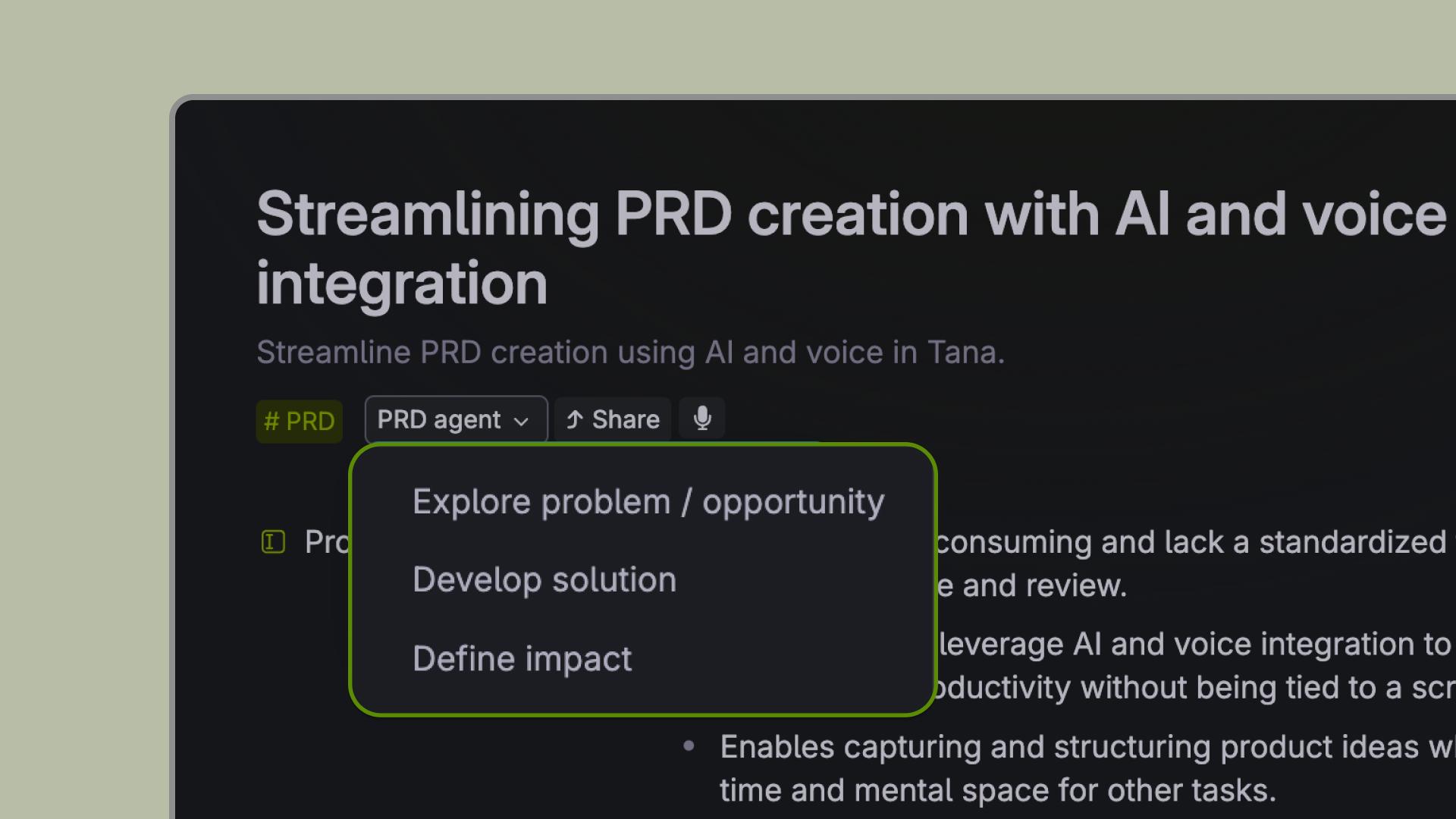 Level up your PRDs before you share them with anyone else using the Tana PRD AI agent. Trained on best-practice product requirement docs this embedded AI agent will ask you thoughtful questions and give tips on how to improve your PRD.